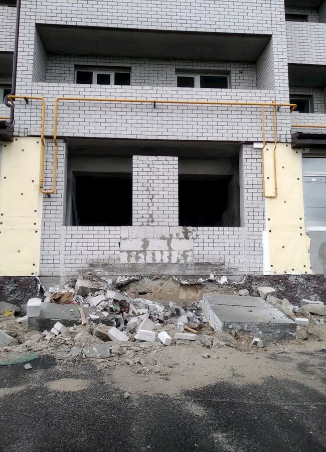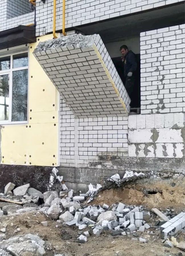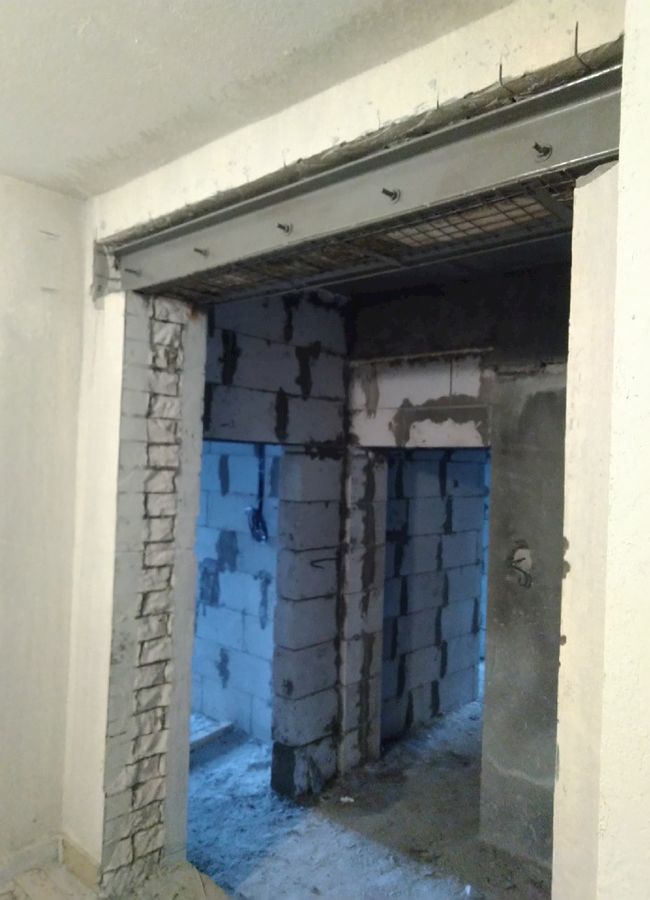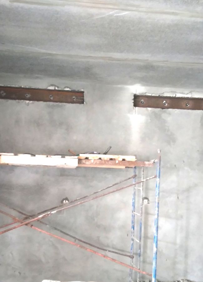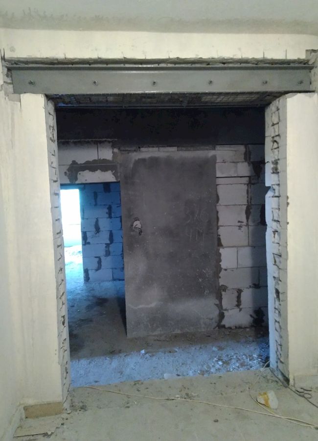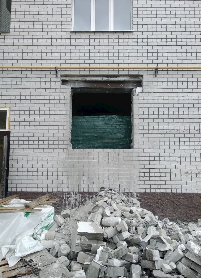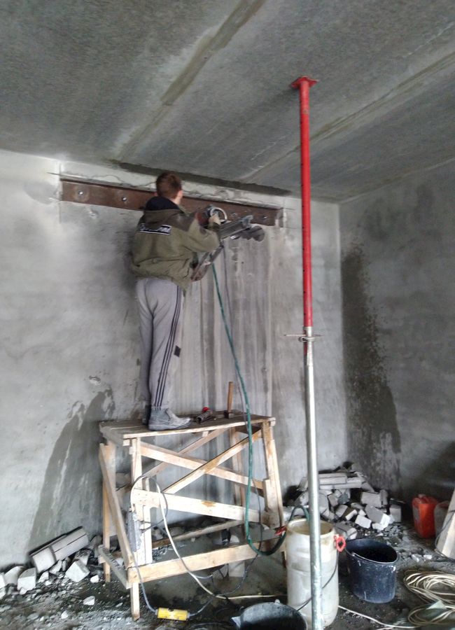 Работы по выбуриванию проёмов в стенах с предварительным усилением заняли больше времени и трудового участия. Работы проводились под руководством прораба, с использованием спецтехники для снятия и демонтажа выбуренных кусков.
