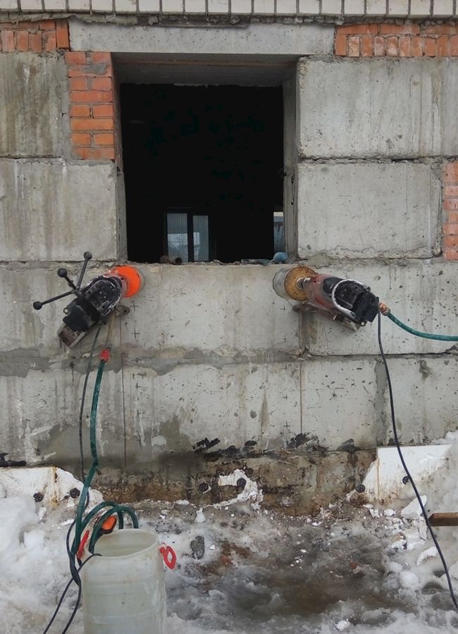 При выполнении работ по выбуриванию дверных проёмов в подвале ЖК мы работали тремя бригадами. Размеры проёмов немного превышали стандартные, примерно 2,3x1м. За один рабочий день наши специалисты выбуривали полтора-два проёма. На выполнение всего объёма нам потребовалось 5 рабочих дней.
